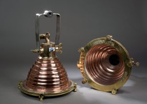 Paire de projecteurs de pont en cuivre et laiton, ouverture type hublot sur le devant avec son berceau.