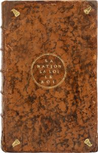 ALMANACH national de France, année commune 1793. L'an IIe de la République. Paris, Testu, s.d., basane fauve marbrée, dos à nerfs, dos et plats ornés de bonnets phrygiens répétés, « La Nation, la Loi, le Roi » frappé au centre des plats...