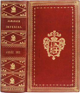 ALMANACH Impérial, pour l’année M.DCCC.XI, présenté à S.M. l'Empereur et Roi, Par Testu. A Paris, chez Testu, s.d., in-8, maroquin rouge, dos lisse orné de l'aigle impérial répété, larges dentelles dorées en encadrement sur les plats,...