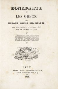 BELLOC (Louise Swanton). Bonaparte et les Grecs, suivi d'un Tableau de la Grèce, en 1825, par le comte Pecchio. Paris, Canel, 1826, petit in-8, demi-basane caramel à coins, dos lisse orné de filets dorés (reliure postérieure).