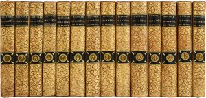 BERTRAND DE MOLEVILLE (A. F.). Histoire de la Révolution de France, pendant les dernières années du règne de Louis XVI. Paris, Giguet et Cie, an 9 (1801)-an 11 (1803), 14 volumes in-8, basane blonde marbrée, dos lisse richement orné (reliure de...