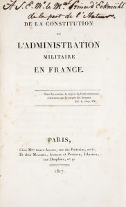 [DAVOUT] - [BALLIET (M.)]. De la constitution de l’administration militaire en France. Paris, Mme veuve Agasse, 1817, in-8, bradel demi-basane maroquinée rouge, dos orné de filets dorés (reliure de l'époque).