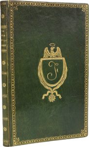 Exemplaire au chiffre supposé de Joseph Fouché, Ministre de la Police, futur duc d'Otrante (1809). L'ouvrage a été acheté dans une vente de la Librairie Simonson en 1989 qui décrivait l'ouvrage comme provenant de la bibliothèque de Joséphine. Il voyait le chiffre comme un J alors que nous l'identifions nous comme un F. L'attribution à Fouché semble probable dans la mesure où il s'agit bien d'un exemplaire provenant d'un haut dignitaire du régime ; l'aigle surmontant le monogramme l'atteste. D'autre part Fouché ne sera fait duc d'Otrante qu'en 1809 et il est logique qu'en 1805, date de parution de l'ouvrage, il n'utilise pas ses armoiries mais seulement son monogramme. Ex-libris, gravé et manuscrit, Bibliothèque d'Ad. Mathieu. Bel exemplaire.