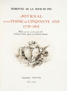 LA TOUR DU PIN (Marquise de). Journal d’une femme de cinquante ans, 1778-1815. Paris, 19071911, 4 volumes in-4, demi-maroquin rouge à coins, dos à nerfs orné, couvertures et dos conservés (reliure moderne).