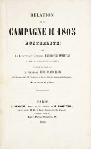 MIKHAILOVSKI-DANILEVSKI (Lieutenant-général). Relation de la campagne de 1805 (Austerlitz). Traduite du russe par le général Léon Narischkine. Paris, Dumaine, 1846, in-8, demi-chagrin rouge, dos lisse orné (reliure de l'époque).