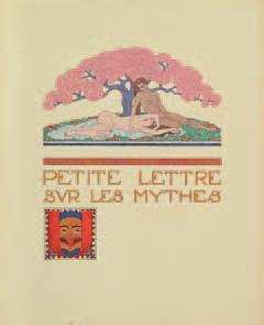 édItIoN orIGINAle de la préface de Paul valéry, Petite lettre sur les mythes. 33 compositions en couleurs de G. Barbier (1882-1932) gravées sur bois par P. Bouchet, dont 2 pour la couverture. « Belle inspiration classique, perfection du tirage des planches, de la typographie et de la mise en page : harmonie des couleurs, richesse de l’or qui soutient l’illustration et donne à ce livre une rare somptuosité. M. Barbier, qui a mis sur pied ce volume, est un des plus avertis parmi les bibliophiles de ce temps. » (B. Martorelli, George Barbier, the Birth of art Deco, p. 139). la maquette typographique a été établie par F.-l. Schmied. l’exemplaire est enrichi : - de l’une des 25 suites en couleurs sur papier du Japon des 33 compositions, soit 30 planches. - de l’une des 25 suites en noir sur papier du Japon des 33 compositions, soit 33 planches. - de 3 aquarelles originales de G. Barbier rehaussées d’or ayant servi à l’illustration. Page de titre : « couple enlacé ». 160 x 130 mm. Frontispice : « Pan et décor de vase grec ». 153 x 127 mm. Première illustration : « deux femmes nues sous un arbuste ». 155 x 128 mm. édition limitée à 150 exemplaires, tous sur le même papier. dimensions : 248 x 198 mm. […]. Bibliothèque des arts de lausanne, François-Louis schmied, le texte en sa splendeur, n° 35, p. 48 ; B. Martorelli, George Barbier, the Birth of art Deco, n° 6.35, p. 174 ; l. carteret, Le trésor du bibliophile, t. 4, p. 195 [« Publication très cotée »] ; M. osterwalder, Dictionnaire des illustrateurs, 1890-1945, p. 76.