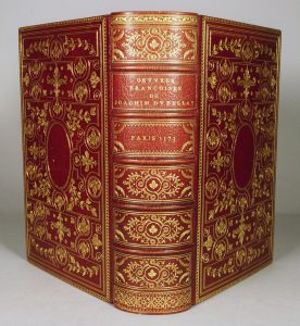 Seigneur. Fort volume in-8 (168x107 mm) ; maroquin rouge pastiche Xvie richement orné. Dos à nerfs richement orné. Double filet sur les coupes. Tranches dorées. Large encadrement intérieur rehaussé d'une roulette et filet dorés. [Capé] 12 ff. n.ch. 559 ff. ch. Et 1 f.n.ch. [a8 ; b4 ; A-Z8 ;Aa-Zz8 ; Aaa-Zz8 ; AE8]. Seconde édition collective, la première à pagination continue. La présente édition contient les huit parties publiées en 1568 et 1569 ainsi que des Epitaphes et des poésies relatives à la mort de Du Bellay. Impression en caractères italiques. [Tchemerzine/Scheler, III, 75d et fac-similé du titre page suivante à la figure II ; Brunet, I, 749]. Dos légèrement passé, mais bel exemplaire en reliure pastiche de Capé. Ex-libris John Whipple Frothingham, Robert Hoe et Bibliothèque Bancel.