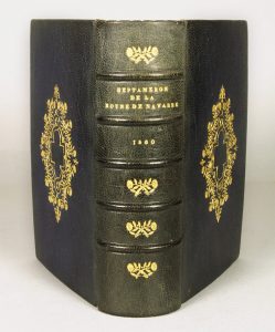 nerfs orné de fleurons dorés. Double filet sur les coupes. Tranches dorées sur marbrure. Dentelle intérieure. [Trautz-Bauzonnet] 16 ff.nch. et 726 pp. dernier f. blanc [a8 ; e8; a-z8 ; A-Y8 ; Z6]. 72 nouvelles. de Backer 248 : » Edition de l'Heptaméron d'une insigne rareté, imprimée en petits caractères ronds ». [Brunet III-1417 : « Edition peu connue décrite par Ebert ». Tchemerzine Iv-378]. Dos passé. Ex-libris John Whipple Frothingham et Robert Hoe.