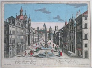 vue, "n° 39" dans le coin sup. dr.— (2). "La Piazza Navona di Roma". Augsburg, G.B. Probst, (2e 1/2 XVIIIe s.), 32 x 43 cm à vue, gravée par Jos. J. Steltzer, "n° 17" en bas au milieu, légendée en latin, français, italien et allemand.