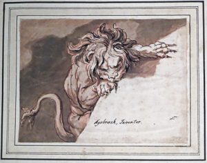 (École anglaise) - Dessin - Rysbrack, John Michael (1694-1770).- Lion s'agrippant à un rocher (vue en plongée). Dessin original, plume et lavis à l'encre bistre sur crayon de sanguine, papier vergé, 12,2 x 16,7 cm, collé en plein sur f. de...