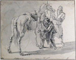 (École flamande) - Dessin - [Attribué à Bloemen, Pieter van (1657-1720)].- Homme ferrant un cheval tenu par deux autres hommes. Dessin original, pinceau et lavis à l'encre grise, papier, 18,5 x 23 cm, collé en plein sur f. de papier fixé sur...