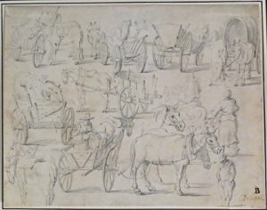 (École flamande) - Dessin - Chariots attelés (étude). Dessin original, pierre noire, papier vergé, 17,8 x 22,7 cm, mention ms. "Brugel" à la plume en bas à dr., collé en plein sur f. de papier fixé par les coins sup. sur carton de support....