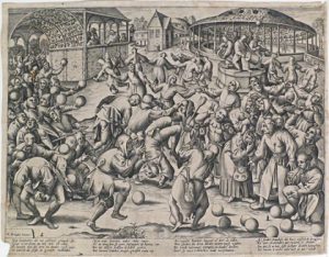 fixée par les coins sup. sur carton de support (faiblement brunie, pet. manque aux coins sup. dr. et inf. g., pet. taches brunes peu visibles à g., plis horizontal et vertical au centre). Deuxième état (sur 3) de cette grande composition figurant de nombreux fous jouant à un jeu de boules. Sujet et tableau typiquement brueghelien avec quatre quatrains flamands dans la marge inf. # van Bastelaer 1 95; # Lebeer 29; # Hollstein (Brueghel) 195; # New Hollstein (id.) 39. ▲ Provenance : Gaston de Ramaix (cachet; # Lugt 4099).