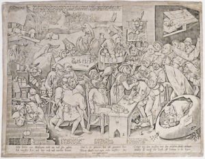 sup. sur carton de support (pet. déchirures marg. sans perte et renforcées, pet. manques de papier marg. comblés au coin sup. g. et à la marge inf.). Cinquième état (sur 5). Grande planche figurant différentes formes de folie et ses symptômes suivant l'imagination populaire parmi lesquels la croissance d'un caillou dans la tête de l'homme excisée ici par une sorcière-chirurgienne. Ce dernier état présente de nombreuses modifications et rajouts, principalement au niveau des légendes. # van Bastelaer 1 93; # Lebeer 28; # Hollstein (Brueghel) 1 93; # New Hollstein (id.) 38. ▲ Provenance : Gaston de Ramaix (cachet; # Lugt 4099).