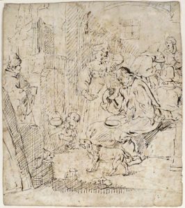 (École flamande) - Dessin - [Attribué à Laer, Pieter Jacobsz. van (1599-c. 1642)].- L' Heure du repas au cabaret. Dessin original, plume à l'encre bistre, papier vergé non filigrané, 25 x 22 cm (annot. mss en italien et traits de plume au...