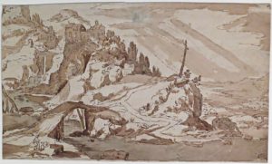 (École flamande) - Dessin - [Cercle de Momper, Josse Ii de (1564-1635)].- Paysage montagneux avec pont, château au sommet d'une colline, calvaire et vallée. Dessin original, plume et lavis à l'encre bistre, papier vergé non filigrané, 22,2 x...