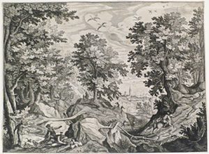 (École flamande) - Ens. 2 grav. - Sadeler, Justus (1583-c. 1620).- Chasseurs dans un paysage vallonné avec vue sur une ville à l'horizon [d'après Paulus Bril (1553/1554-1626)]. Eau-forte, Tc 19,8 x 26,6 cm, papier vergé non filigrané, fixée...