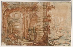 (École flamande) - Dessin - [Attribué à Stevens, Pieter Ii (c. 1567-1624)].- Ruines antiques en Italie. Dessin original, plume à l'encre noire, lavis à l'encre bistre, rehauts à l'aquarelle bleue et rouge, papier vergé, 18,9 x 29,6 cm, collé...