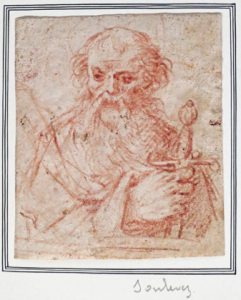 (École française (?)) - Dessin - Buste d'homme tenant une épée (Saint Paul ?). [Tête d'homme au verso]. 1re moitié du 17e siècle. Dessin original, sanguine, papier vergé non filigrané, 10 x 8,8 cm, fixé par les coins sup. sur carton de...