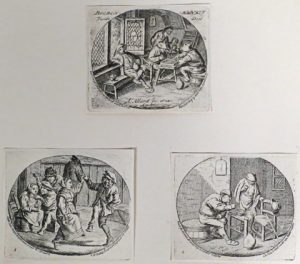 (École hollandaise) - Ens. 7 grav. - Allard, Abraham (c. 1676-1725).- "Boeren Banket. Twêde Deel." Amsterdam, A. Allard, s.d. 6 eaux-fortes num., diam. c. 7,3 x 8,5 cm + petites marges, papier vergé non filigrané, fixées 3 par 3 par les coins...