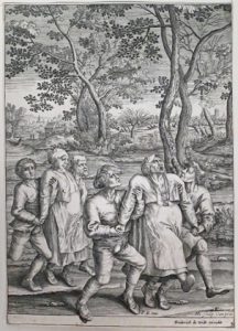 (École hollandaise) - Hondius, Henricus I (1573-1651).- Deux groupes de paysans se dirigeant vers la droite [d'après Pieter Brueghel (c. 1525-c. 1569)]. Eau-forte, Tc 22,2 x 16,0 cm, papier vergé filigrané (tête humaine), fixée par les coins...