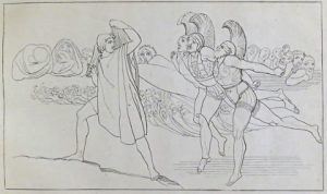 Flaxman, John (York 1755-1826 Londres).- Sujets de l'Odissée [sic] d'Homère [...]. [Paris, Bance aîné, 19e s.]. In-f° oblong; titre gravé et 28 pl. (qqs rouss.). Rel. de l'époque : demi-basane brune à coins de vélin, plats de papier marbré,...