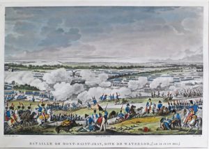 (France, Napoléon) - 25 planches : bataille de Waterloo (Mont-Saint-Jean). Techniques variées (eau-forte, bois, acier ou lithographie), formats divers de c. 12 x 16 cm à 40 x 60 cm, rehaussées à l'aquarelle sauf 2 (faibles rouss. à qqs pl.)....