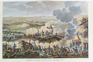 (France, Napoléon) - Vernet, Carle (1758-1836).- 7 grandes vues des batailles d'Arcole, Austerlitz, La Favorite, Marengo, Naples, Rivoli et Turin. Eaux-fortes, c. 25 x 40 cm + marges, rehaussées à l'aquarelle, fixées par les coins sup. sous...
