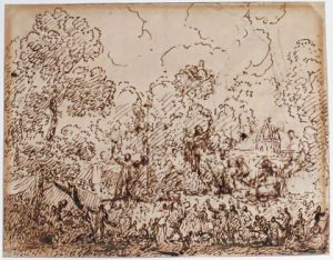 Dessin - [Attribué à Leprince, Auguste Xavier (1799-1826)].- Foule s'agitant devant les Invalides à Paris (?). Dessin original, plume à l'encre bistre, papier vergé non filigrané, 15,2 x 19,3 cm (une autre esquisse au verso, monté sous...