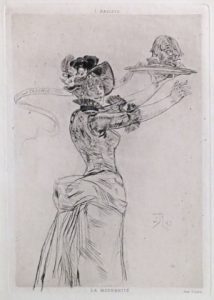 Rops, Félicien.- 2 héliogravures, sur papier vergé, parues dans "L'Artiste". Sous passe-partout de papier blanc. (1). Modernité. 20 x 13,5 cm. Publiée en octobre 1886. Pointe sèche; # Rouir 767.5/6 (état avec la lettre).— (2). Dimanche ou...