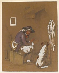 Dessin - Vernet, Carle (1758-1836).- Homme en costume traditionnel (breton ?) avec un chien. Dessin original, pierre noire avec rehauts à l'aquarelle rouge et bleue et à la gouache blanche, papier brun, 27 x 21,5 cm, signé et daté "1827" en bas...