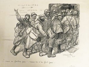 Ens. 4 grav. - Steinlen, Théophile Alexandre (1859-1923).- 3 estampes figurant des Poilus. Eau-forte (rognée en haut et pet. tache) et 2 lithographies, c. 45 x 60 cm. Joint, même thème : RENOUARD, Paul (1845-1924).- Soldats avec baïonnettes....