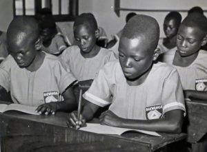 crocodile (rel. défraîchie). Vendeuses au marché (1), vues de l'école (6 dont 1 de la chapelle et 1 de l'église), cours réservés aux garçons ou aux filles (couture, écriture, lecture... ), rangs de filles ou garçons des petites et moyennes classes dans la cour de récréation (5), dispensaire médical (2 : couveuses pour bébés et salle d'accouchement), distribution du repas (2), photo des professeurs en footballeurs (1), etc.