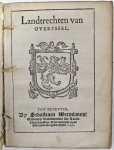 (Pays-Bas, Droit) - Landtrechten van Over-Yssel. Deventer, Sebastiaen Wermbouts, 1630. 2 delen in 1 vol. in-4° : [4]-81 [i.e. 79], 106-[2] pp. (hs aantekeningen met pen). Eigentijdse Hollandse spitselband : soepel perkament met overslag, gladde rug...