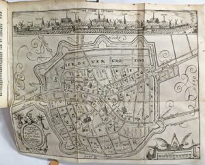 Hollandse spitselband : perkament, titel en wapenschild in pen op effen rug, platranden omgezet (licht vervuild). Eerste uitgave geïllustreerd met 9 uitslaande platen (plattegrond met panoramisch zicht op Leiden, belegeringen en historische taferelen), 10 tekstfiguren met afbeeldingen van universitaire gebouwen en 1 houtsnede met penningen in de tekst. Orlers (1570-1646), boekhandelaar en historieschrijver te Leiden waar hij eveneens verscheidene openbare functies bekleedde, is ook de auteur van "Den Nassauschen Lauren-crans" uit 1610. # NNBW I-1 391 . ^ Édition originale de cette histoire de la ville de Leiden et de son université par l'auteur d'une généalogie des Nassau. Illustrée de 9 h.-t. dépl. et 1 1 texto. Plein vélin de l'ép. (manquent les pp. 109-110, faible mouill., rel. lég. défraîchie).