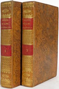 [4]-xxvi-456 [i.e. 556]-[1], [4]-474-[1] pp.; 1 h.-t. (rousseurs +/- concentrées). Rel. de l'époque : plein veau raciné, dos lisses fleuronnés dorés "à la grotesque" avec fleurons romantiques et étiq. de cuir rouge, tranches marbrées assorties aux gardes (mors sup. du t. Ii part. fendu). Édition originale illustrée du portrait de l'auteur en lithographie. L'ouvrage est la transcription, sur le ton léger de la conversation, d'entretiens que l'auteur eut avec un sénateur russe et un chevalier français réunis les soirs d'été dans une datcha au bord de la Neva. Joseph de Maistre (1753-1821) y expose sa conception du gouvernement, la vie des peuples devant reposer, selon lui, sur l'autorité souveraine du roi et sur le ministère de l'Église (# www.devoir-de-philosophie.com). De Maistre avait été envoyé en Russie par le roi Victor-Emmanuel Ier de Sardaigne comme ministre plénipotentiaire de 1802 à 1817, époque faste pendant laquelle, très apprécié des nobles russes et du Tsar Alexandre Ier, il obtint diverses importantes responsabilités, correspondit et étudia beaucoup. ▲ Provenance : bibliothèque de Montmirail (cachet du XIXe s.).