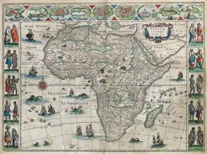 Continent africain avec la Méditerranée, l'Arabie Saoudite, les îles Canaries, Madagascar et le Cap-Vert. Planche agrémentée d'un cadre de 1 9 cartouches figurant des plans et vues (Alger, Alcair, Alexandrie, Ceuta, Tanger, Tunis...) et des peuples autochtones. Paru pour la première fois en 1630 dans l'"Atlantis Appendix" de Blaeu. # van der Krogt [8600:2].