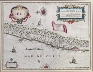 (Amérique du Sud) - Blaeu, Guillaume.- Chili. Gravure sur cuivre, Tc 35,5 x 48 cm + marges, partiellement rehaussée à l'aquarelle (pli central). Sous passe-partout, vitres (recto et verso) et cadre de bois doré (non désencadrée). Vue...