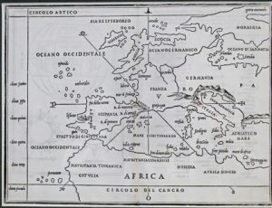 (Europe) - [Bordone, Benedetto.- Europa]. Gravure sur bois, Tc 28,5 x 38 cm + marges (pli central). Sous passe-partout (à double face), vitre et cadre de bois doré (non désencadrée). Carte d'une grande partie de l'Europe et de l'Afrique du Nord...