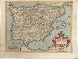 (Europe, Espagne) - Ortelius, Abraham.- Regni Hispaniae post omnium editiones locupletissima descriptio. [1598]. Gravure sur cuivre, Tc 38,3 x 50 cm + marges (pli central, traces de montage au verso). Carte de la péninsule ibérique et des îles...