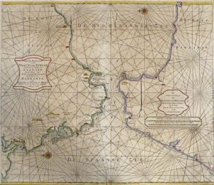 Détroit de Gibraltar orientée vers l'est avec les côtes méridionales de l'Espagne (de Saint-Lucar à Malaga et Cadiz) et les côtes septentrionales du Maroc (de Larache à Penon de Velez avec Tanger et Ceuta). Extraite de la seconde partie du "Nieuwe Groote Ligtende Zee-Fakkel" paru pour la première fois en 1734. # Koeman IV, 343[Keu 100], 392[458] et 331[246].