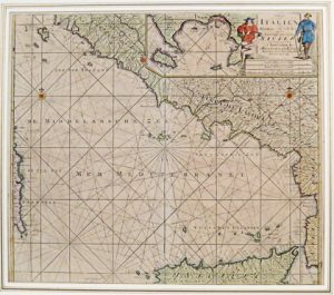 Sous passe-partout. Carte de la mer Tyrrhénienne avec plan détaillé de la baie de Naples et des îles d'Ischia et Capri, agrémentée d'un cartouche. Troisième état de cette carte extraite de la 3e partie du "Nieuwe Groote Ligtende Zee-Fakkel" (additions : miles italiens, "Naau of Straat van Messina" et nomenclature topographique). # Koeman IV, 343[Keu 100] et 383[107]**.