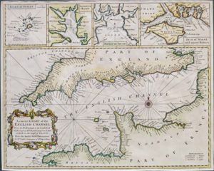 l'aquarelle (pet. déchirure dans le bas). Sous passe-partout, vitre et cadre de bois doré (non désencadrée). Carte de navigation de la Manche avec le détail des îles de Scilly, Falmouth Haven, Plymouth Sound and Wight. Extraite de "The Continuation of Mr. Rapin's History" par Nicolas Tindal paru c. 1732. # Tooley IV-139.