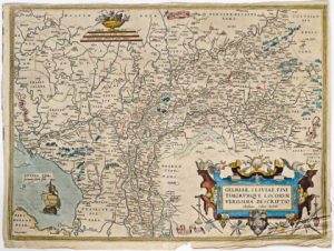 (Europe, Pays-Bas) - Ens. 3 cartes - Ortelius, Abraham.- Gelriae [sic], Cliviae, Finitimorumque locorum verissima descriptio. [1581]. Gravure sur cuivre, Tc 36,5 x 50 cm + très petites marges, rehaussée à l'aquarelle (marge dr. renforcée,...