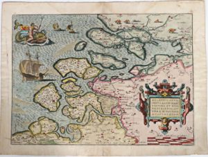 qqs taches). Carte de la Zélande d'après Jacob van Deventer. Ornée d'un grand navire et d'un monstre marin avec Neptune portant les armoiries de Zélande. Extraite des éditions de l'atlas de 1572 et 1574. Texte en français au verso (p. 18). # van den Broecke 78; # van der Krogt [3600:31] (variante a).
