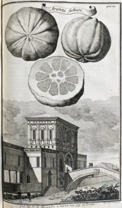 Zugabe etlicher anderer Gewâchse [...]. [- Continuation der Nürnbergischen Hesperidum, oder Fernere gründliche Beschreibung [...]]. Nürnberg, Johann Andreae Endters seel. Sohn und Erben, 1708 [- 1714]. 9 parts in 2 vol. inf : [16]-255-[8]-17-[3] pp., [21]-239-[4] lvs; 251 (on 252) plates (missing plate "Lima romana", clear marginal staining at innerfold and bottom of vol. I, stain on pl. p. 236, small marginal wormhole at innerfold of first 50 pages of vol. I, bottom of half-title, title-page and front. of vol. Ii remargined, clear waterstain with mould at the bottom of vol. Ii, some small marginal tears repaired). Contemporary bindings : pigskin, boards with rectangular patterns of blind stamped fillets and roll-stamps, ribbed spines, red sprinkeld edges, clasps (handwritten vol. number and date in blue pencil on spines, slightly rubbed, clear dampstain at the bottom of 2 boards). First edition of this very rare "attractive book with decorative plates of fruit, landscape and houses" (cfr Sitwell). "An astonishing book with a series of magnificent plates in which the fruits are almost subordinate to views of gardens. A few of these are Italian [Verona, Venice, Lake Garda...] but they mostly illustrate those of the German [noble and] patrician families [Nürnberg, Passau, Schônbrunn...]" (cfr Plesh). Prestigious publication by Volckamer (Nürnberg 1 644-1 720) who, all in the tradition of the noble and wealthy families of the 1 7th Century, was interested in the art of the garden and particulary in cultivating varieties of citrus fruits. Vol. I contains 1 8 vignettes, a frontispiece, 4 engraved titles and 1 1 1 plates (7 folding) of prestigious gardens and large fruits, mostly citrus, floating over gardens, palaces, townhouses and landscapes, some plates figure flowers, seeds or vegetables, some a sun-dial, methods to draw perspective views ofgardens, the "Columnae milliarum" and the "Obeliscus Constantinopolis". Vol. II contains 7 vignettes, a frontispiece, 4 engraved titles and 130 plates (17 folding) of gardens and fruits, again mostly citrus but also pineapple and coconut. Most of the fruit drawings are by J. Chr. Volckamer himself while the perspective views of gardens and palaces are by Paul Decker the Elder and the Younger. # Nissen, BBI, 2076 and 2078 (totalises only 249 plates, all included); # Hunt 420; # Sitwell 148 (1st vol. only); # Plesch 798 (id.); # Pritzel 9848, 9849; # "Livres de fruits". [Cat. expo] Namur, 1992, pp. 135-140; # "Images de Jardins". [Cat. expo] Namur, 1996, p. 143 (2nd vol. only). ▲ Provenance : Count Félix Goblet d'Alviella (1884-1957, lawyer and specialist in forestry (emblazoned ex-libris; # de Jonghe d'Ardoye 734); Clemens Reitmayer, Brüssel (id.). ^ Prestigieux ouvrage consacré principalement à la culture des agrumes et à l'art du jardin par un patricien allemand. Illustré de 2 frontispices et 8 titres gravés, 241 planches principalement de fruits représentés à une très grande échelle et donnant l'impression de flotter au dessus de jardins, de palais ou de paysages avec architectures. Pleine peau de truie estampée de l'ép. (manque 1 pl. au vol. I, mouill. en queue des 2 vol. et moisissures en bas du vol. II, qqs pet. imperfections).