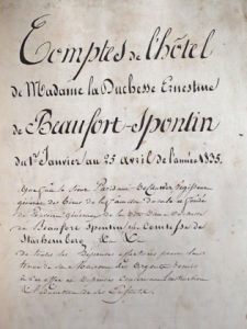 (Belgique, Archivalia) - Livre de comptes de la Maison de la duchesse de Beaufort-Spontin et du tutorat de ses enfants. [Château de Freÿr, Namur], 1828-1854. In-f° (H. : 4,5 cm de documents mss., qqs pp. avec sceau). Rel. de registre de l'époque...