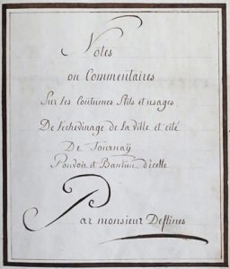 (Belgique) - "Notes ou Commentaires sur les coutumes stils et usages de l'échevinage de la ville et cité de Tournaÿ. Pouvoir et banlieu d'icelle. Par monsieur Deflines". [18e s.]. In-f° : [1]-221-[9 bl.] ff. (mouill. passim sinon bonne...