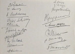 (Belgique & Art) - Recueil de signatures de diverses personnalités belges, surtout anversoises, du monde artistique ou littéraire. "13 avril 1930". In-8° carré : [10] ff. (dont 3 portant les signatures et 2 illustrés). Rel. originale de...