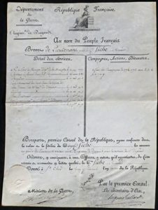 Roger dans la partie sup., cachet sec figurant Marianne. Nomination d'Armand Fiche au poste de lieutenant de 1er Régiment de dragons, contresignée par le ministre de la guerre Louis-Alexandre Berthier et le secrétaire d'État Hugues Maret.